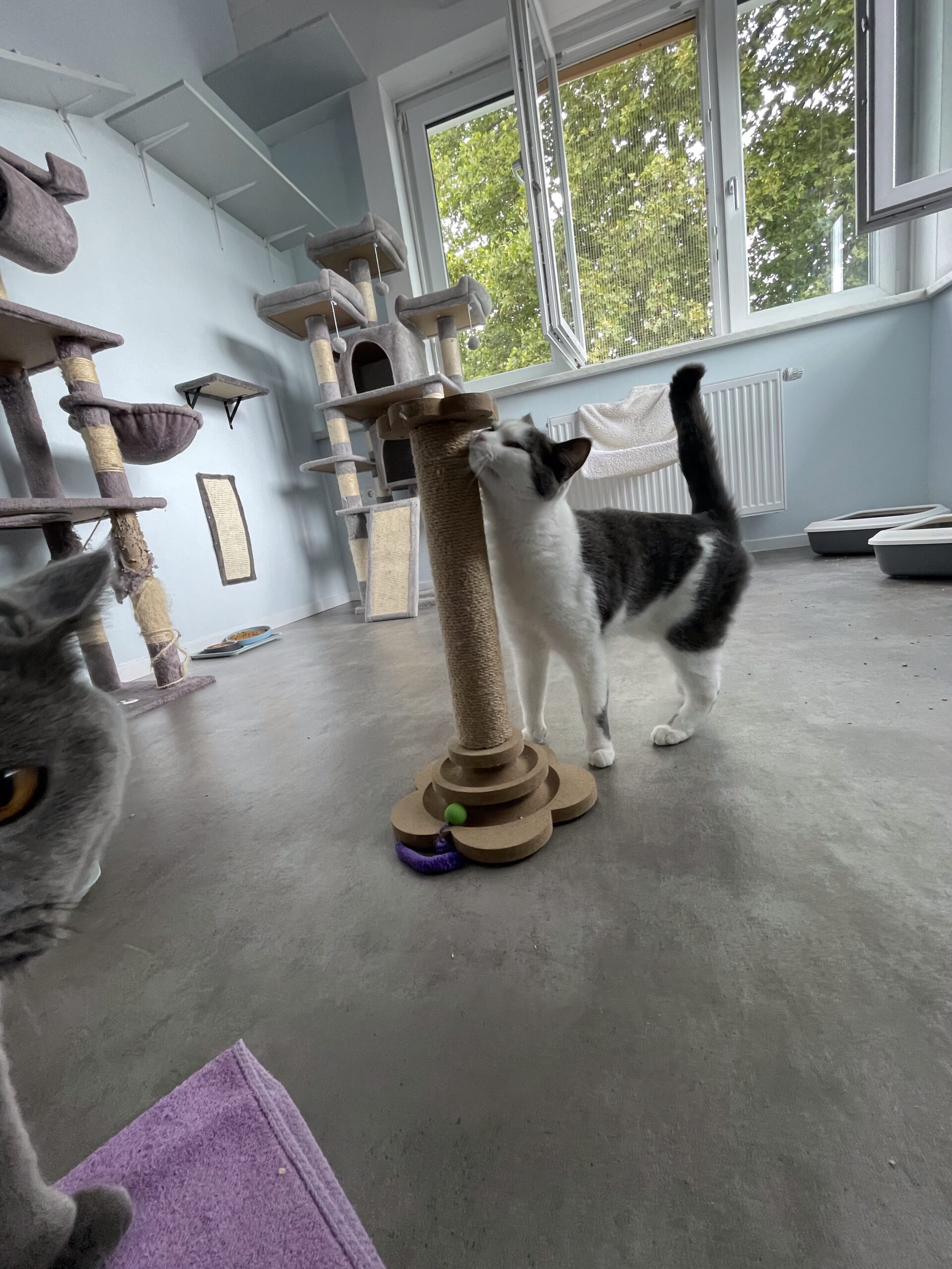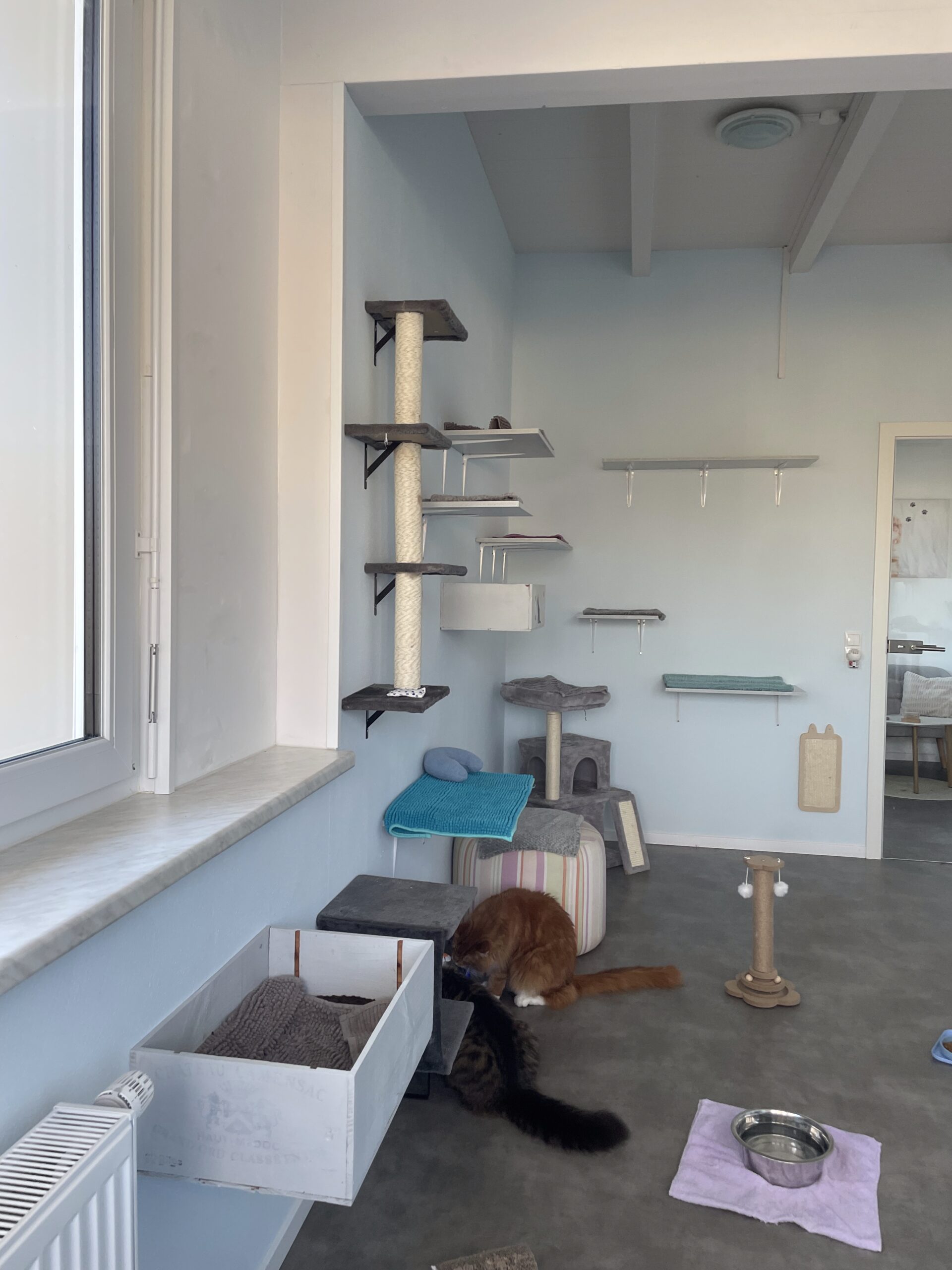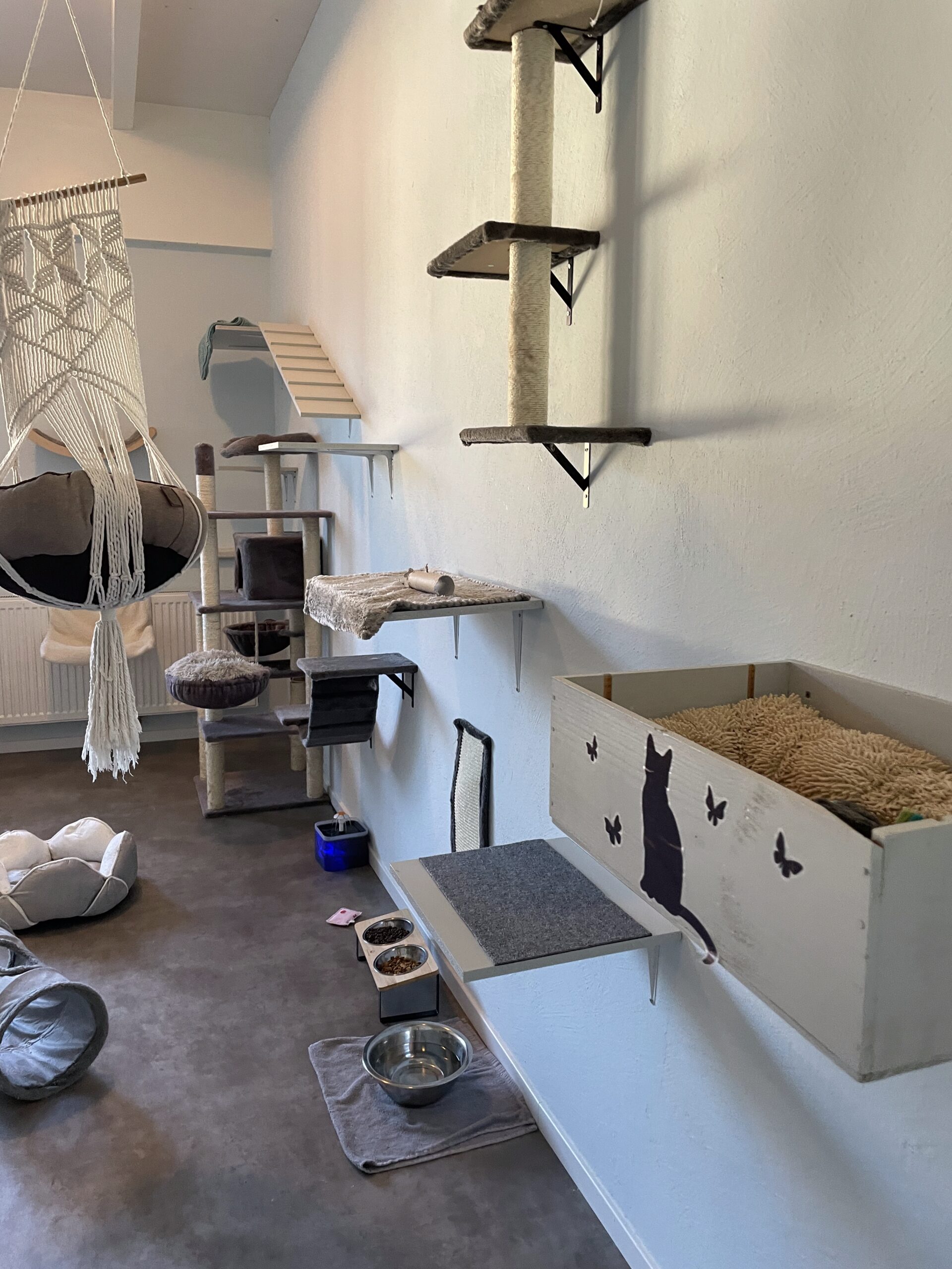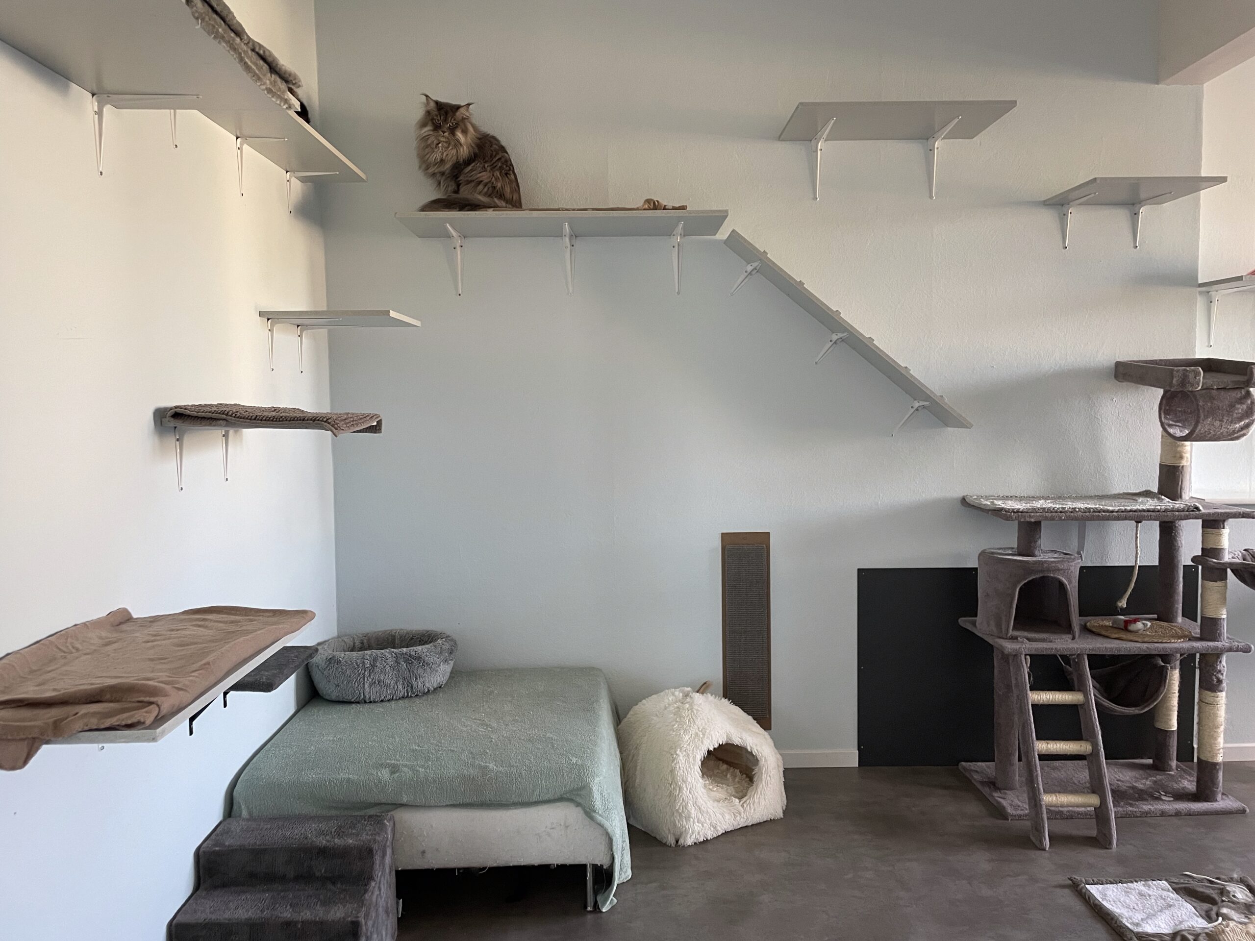 In unserem Zimmer Kletterparadies können Ihre Katzen ihre Abenteuerlust voll ausleben. Mit zahlreichen Kletter- und Sprungmöglichkeiten gibt es viel zu entdecken und zu erkunden. Hier können sie hoch hinaus und ihre Umgebung aus luftiger Höhe beobachten, während gleichzeitig gemütliche Ruheplätze zum Entspannen einladen. Ein echtes Highlight für kleine Klettermeister!